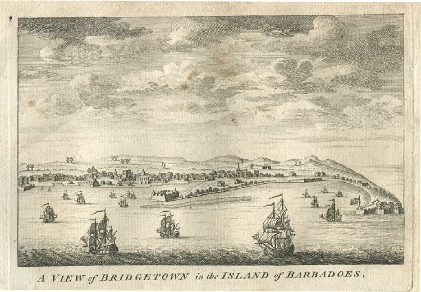 Many ships find safe harbor in the beautiful cove called Carlile Bay. Image from the mid-1700s. From the Barbados National Trust.