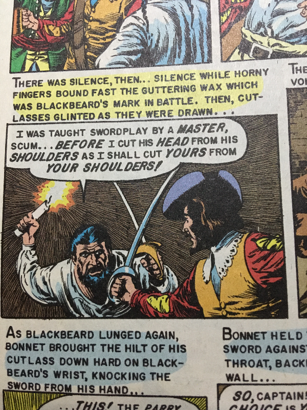 The Piracy comics of the 1950's by EC Comics were unique mostly fictional tales of the pirates. This story has Blackbeard and Bonnet ultimately ending up as rivals and both perishing close to the same time.